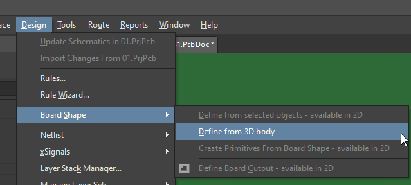 3. While in 3D Mode, go to Design » Board Shape » Define from 3D Body
