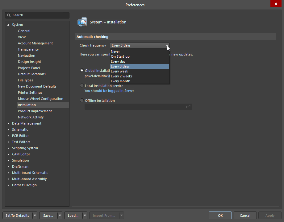 to configure Altium Designer Agile’s installation and update notification settings. The latter opens the System – Installation page of the Preferences dialog, where you can configure how frequently Altium Designer Agile will check for software updates and notify you (