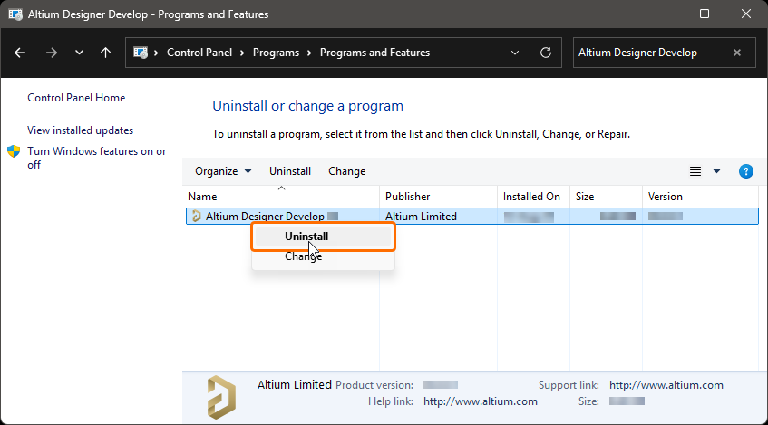 If you have installed multiple instances of Altium Designer Develop, ensure that the correct instance is being uninstalled. It can be a good idea to have the Version attribute displayed as an additional column on the Programs and Features page so that the correct instance can be quickly verified.