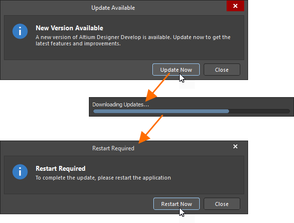 Depending on how you have configured your automatic checking for updates, a pop-up dialog will open when you launch Altium Designer Develop notifying you that a later version of the software is available. Clicking