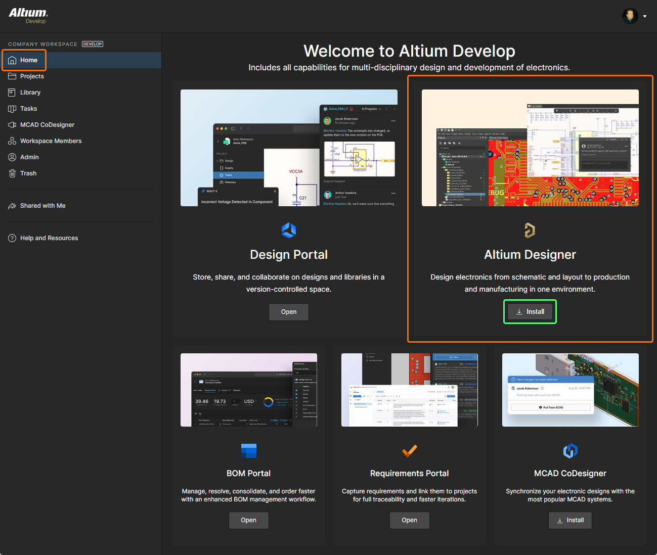 To access the Altium Designer Develop Installer, you need first to download and run an executable – AltiumDesignerDevelopSetup.exe. This executable is downloaded from the Home page of the browser interface of your Altium Develop Workspace (