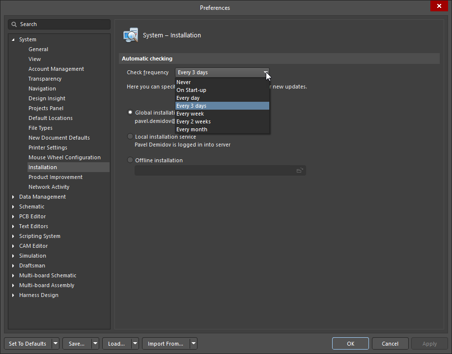 On the System – Installation page of the Preferences dialog, you can configure how frequently Altium Designer Develop will check for software updates and notify you. Note that an option is available to check for new updates each time Altium Designer Develop is launched. This is the On Start-up setting in the Check Frequency drop-down menu.