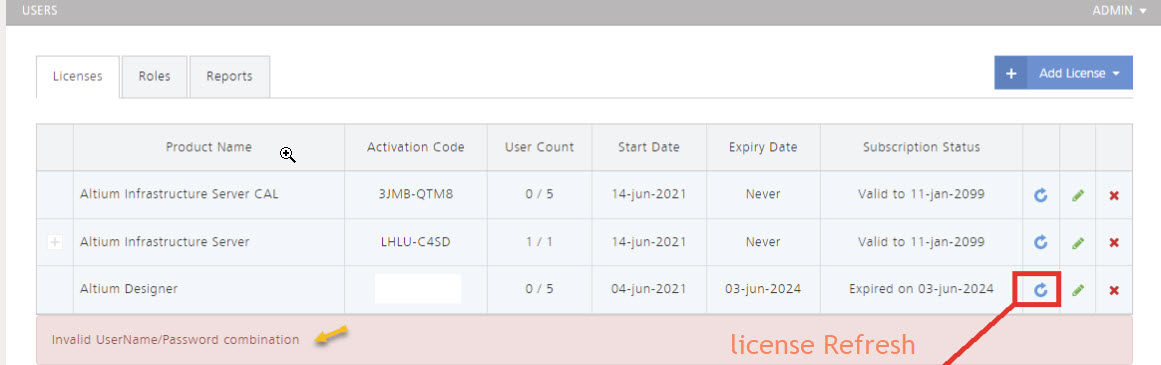 When attempting to refresh a license in the Server Browser interface of Altium Infrastructure Server (AIS), users may encounter the error message "Invalid Username/Password combination", even when logged in with administrative privileges. This issue typically arises due to incorrect AltiumLive credentials configured in the server settings. To resolve it, users must update the credentials with valid AltiumLive admin account details or manually add the license if online access is restricted.
