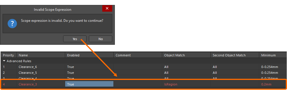 当从 PCB 访问约束管理器时,如果范围查询表达式因语法等原因被判定为无效,现在会在 All Rules 视图中显示警告对话框。要保留无效范围,请在对话框中单击Yes 。这将导致无效规则以红色高亮显示(如下所示)。单击No 可恢复为先前(有效的)范围。