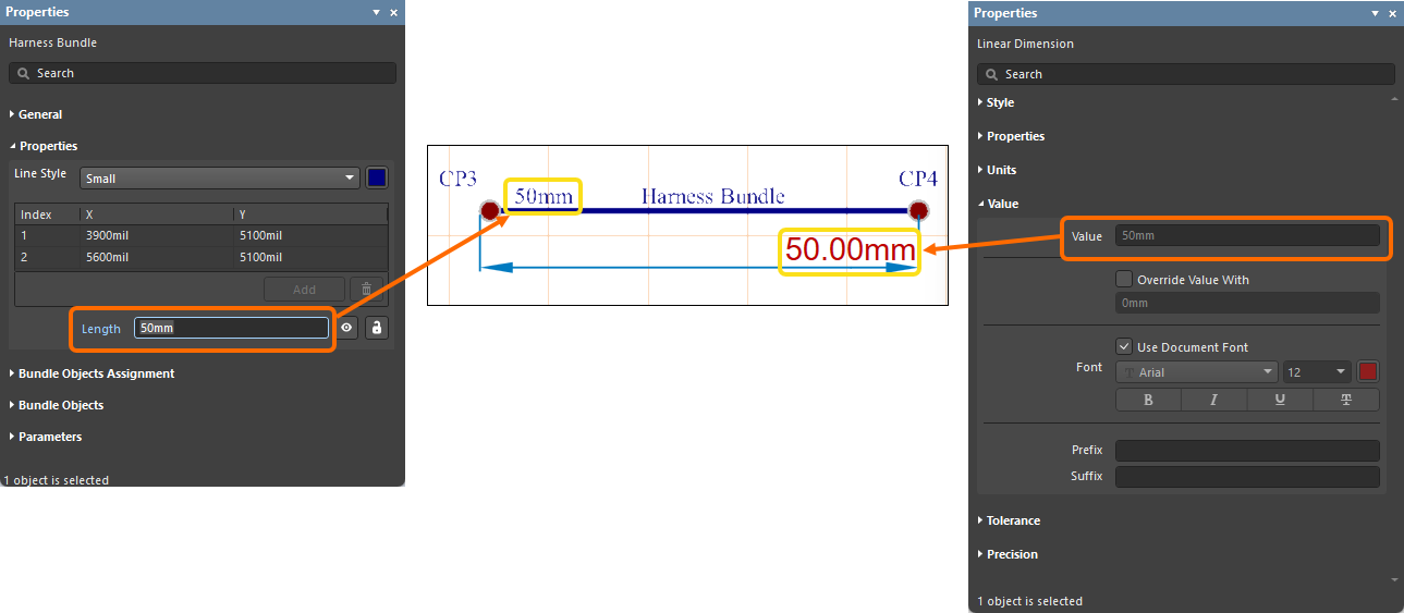 当在线束制造图纸 (*.HarDwf)的布局绘图视图上的连接点之间放置线性尺寸时,Value 字段(尺寸的长度)现在会自动填入相应的线束长度。