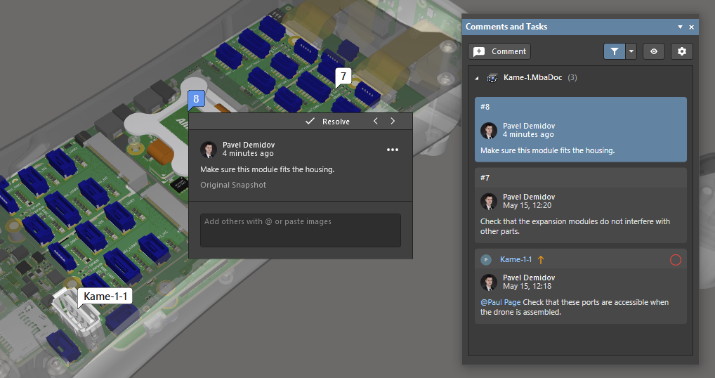 对于由 Altium 356 工作区托管的多板设计(并使用其原生版本控制),现在可以在多板装配文档(*.MbaDoc)中添加和管理注释。注释可添加到设计空间中的某一点,也可分配给特定的工作区成员,本质上是为其创建任务。
