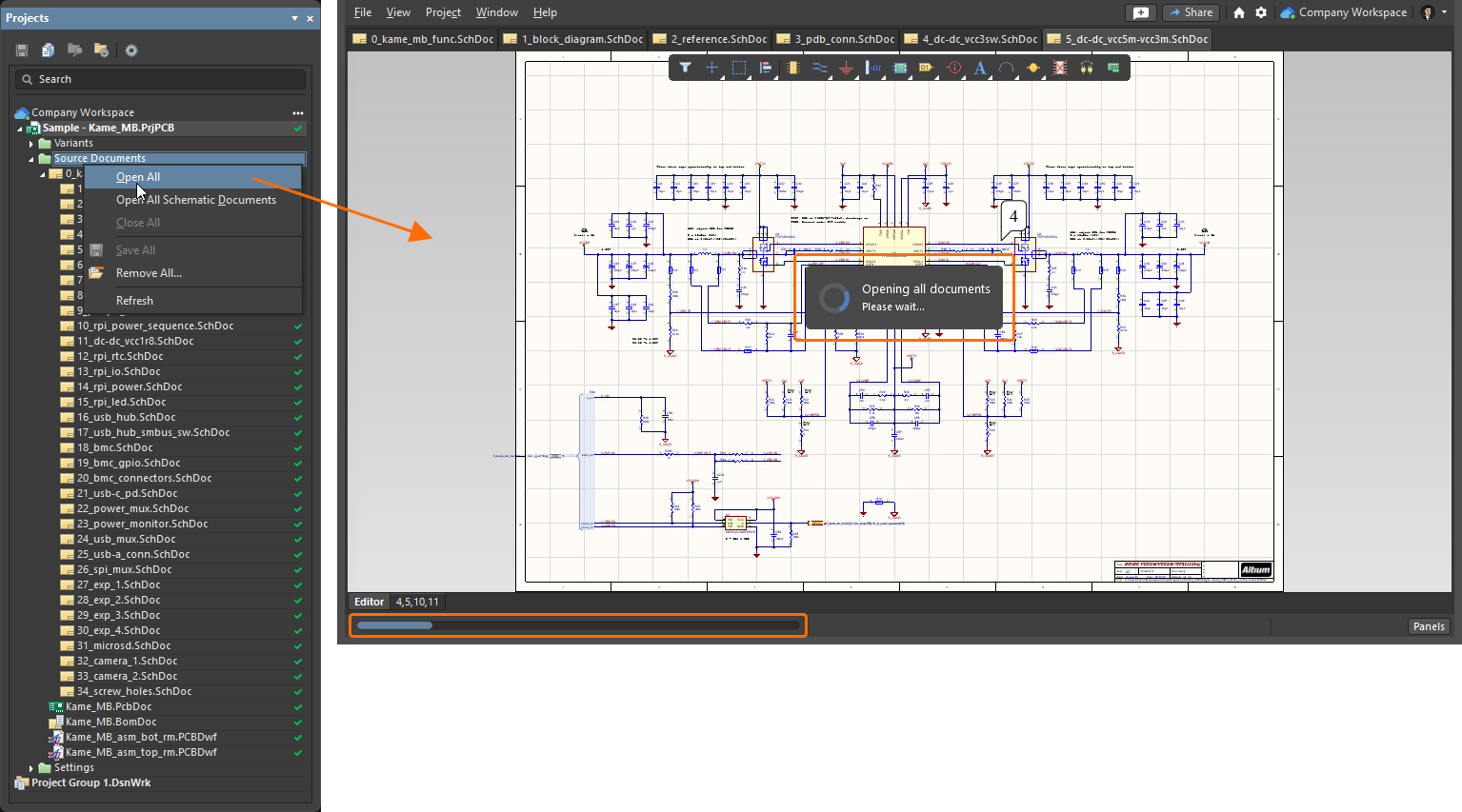 当您在Projects面板的某个子文件夹上右键点击Open All 或 Open All Schematic Documents 命令时,现在会显示 提示信息和进度条,以便您查看文档打开的进度。