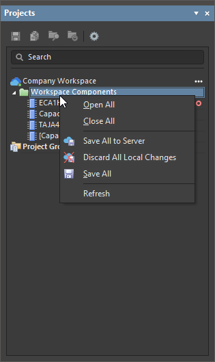 从 Workspace Components 子文件夹的右键上下文菜单中,可以打开组中的元件、关闭、本地保存、保存到连接的工作区或放弃更改(不修改直接关闭)。