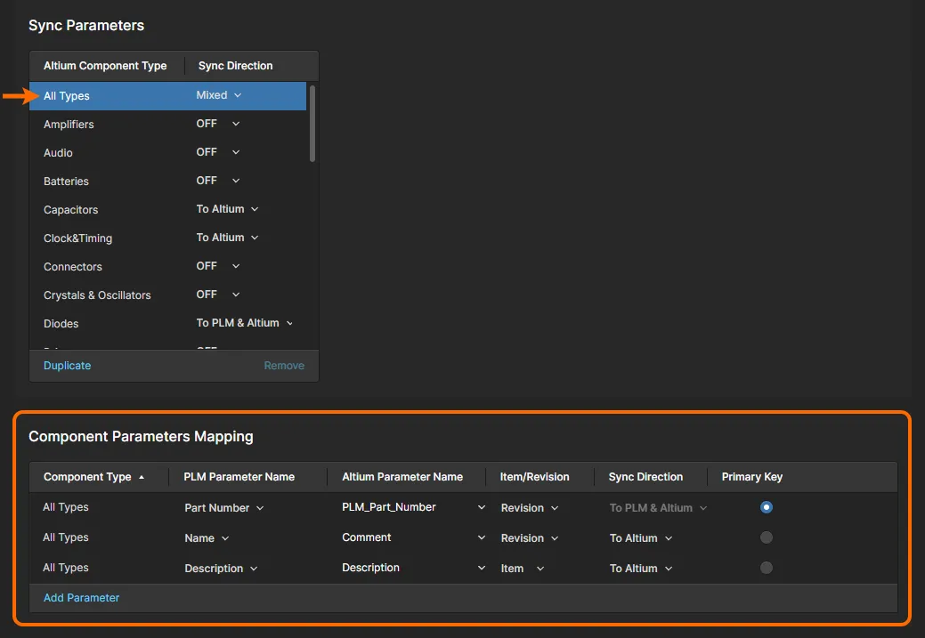 Create mapping entries (Add Parameter) that will apply to all components by including known common parameter matches. and set the Item/Revision and Sync Direction options as required. It is also important to specify a mapped parameter entry as the Primary Key – this is a common parameter pair that serves as the reference index between the two sets of parametric data. When this is a PLM Part Number (recommended), the number created on the PLM side is propagated back to the Altium side creating a known reference link between the sets of synchronized component data.