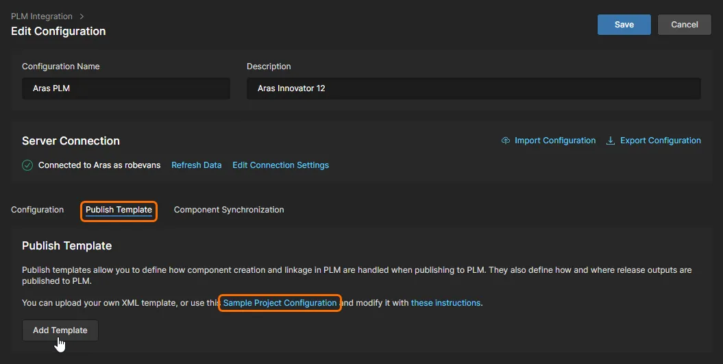 Add a suitable Publishing Template XML file under the Publish Template tab when creating or editing your PLM configuration. Use the Sample Project Configurations link to download an archived collection of templates for supported PLM systems.