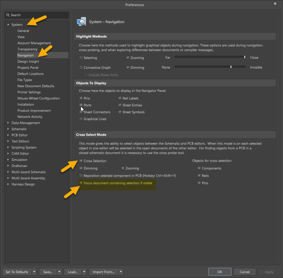 - Focus document containing selection if visible - enable to transfer focus to the schematic or PCB document that is visible when objects in them are cross-selected.