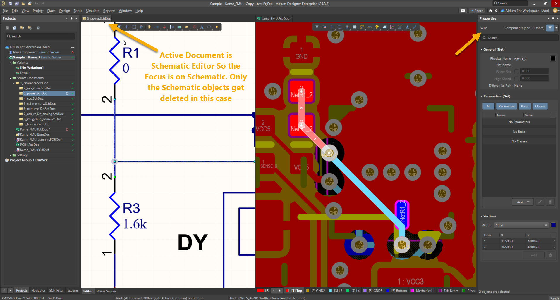 If the PCB and schematic documents are open in separate Altium Designer windows or a split window, the focus is transferred to the schematic when you select an object in the PCB or vice versa with this setting. Caution should be taken regarding which document is active when pressing delete. The cross-selected objects might be deleted instead of those intended to be deleted.