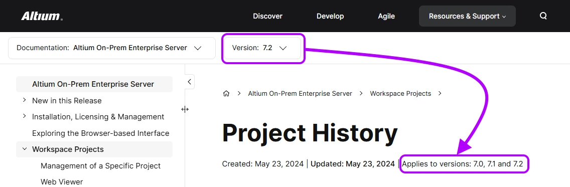 The following image illustrates such indication. Here, version 7.2 of the page detailing the Project History feature is open. This content equally applies to versions 7.0 and 7.1 of the software. In other words, there is no difference in content for the page if you set the version selector for the documentation to 7.0, 7.1 or 7.2.