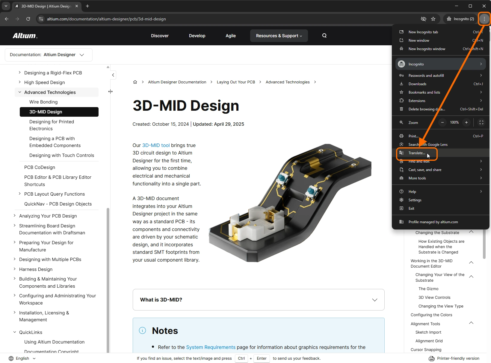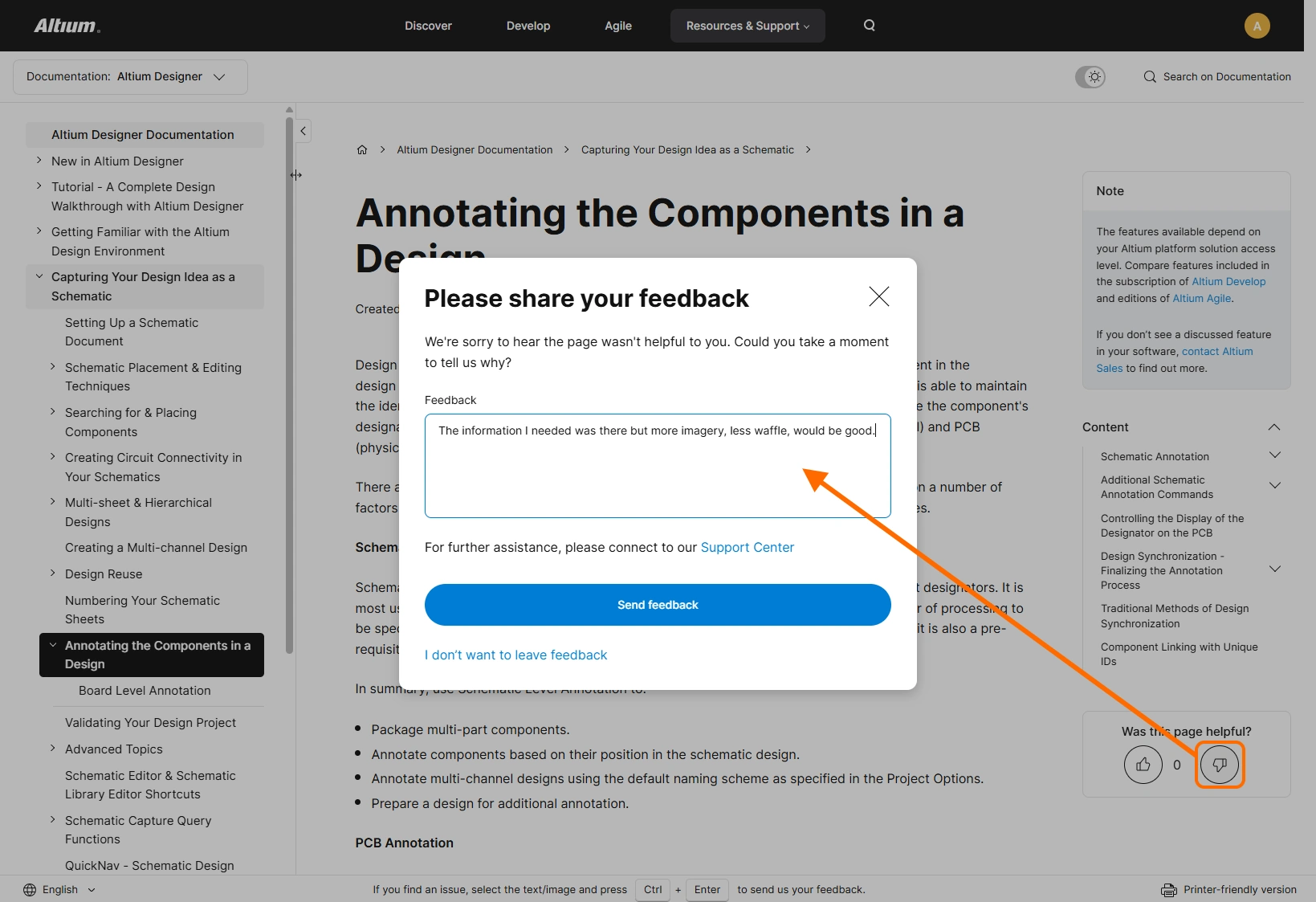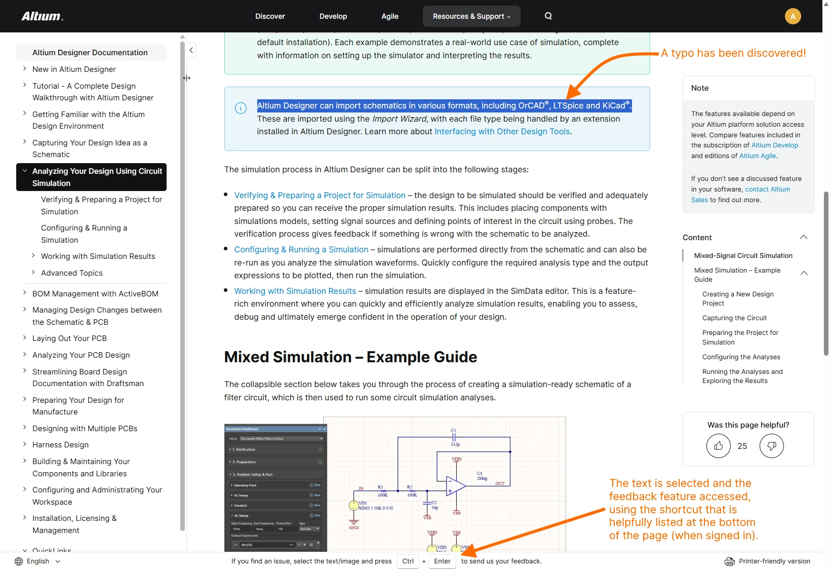 Documentation Feedback (displayed when signed in to your Altium account) – this feature provides you with a quick avenue to send the Technical Documentation team your feedback on a page, geared more towards highlighting typos, incorrect/outdated information, or missing information. Simply select text and/or an image on the page and use the