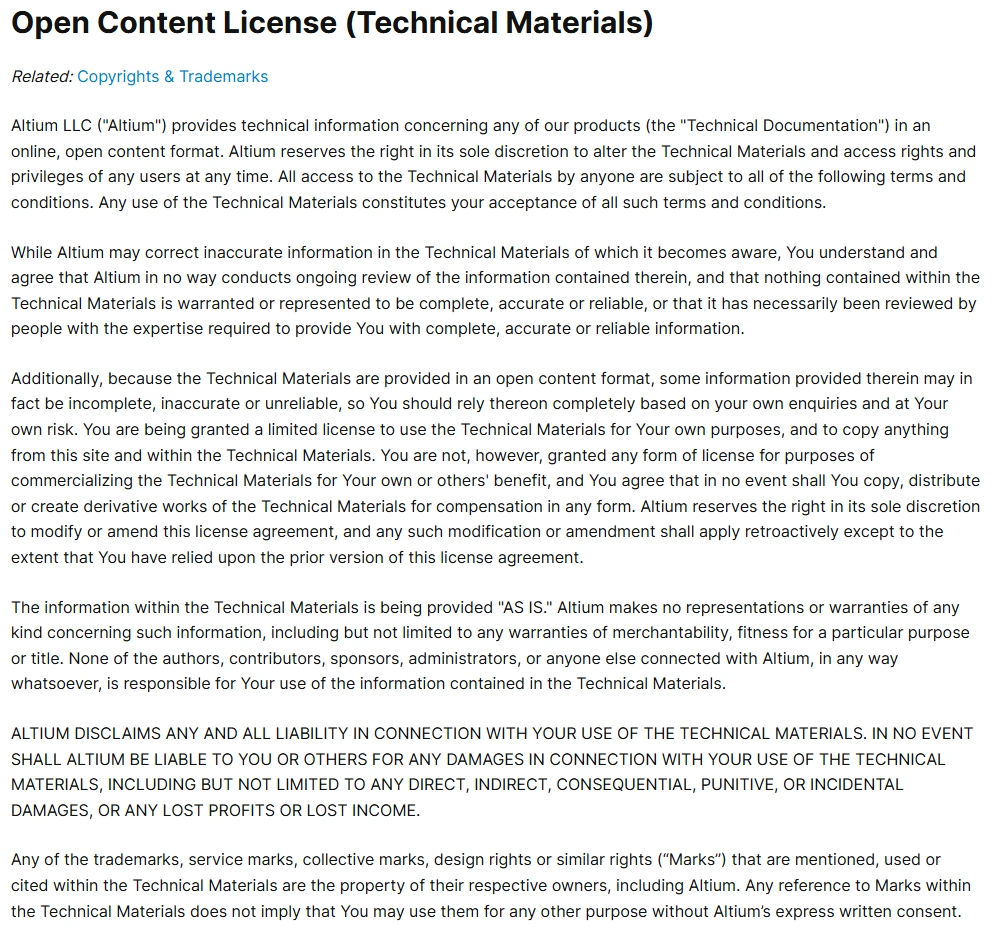 Copyright information covering the Technical Documentation is conveniently shown in the image below and is accessible from the QuickLinks section of the Nav Tree pane (Documentation Copyright Information), which is available when viewing any page within the technical documentation. The page includes a link to the Copyrights & Trademarks page of the main altium.com website.