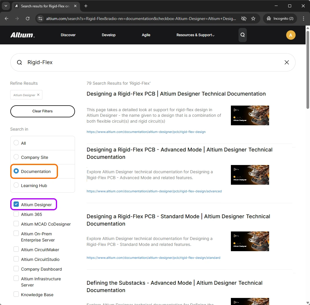 Aiding to help you find information within the technical documentation for Altium design solutions, is a powerful Search facility. Powered by Google, there is in fact one search facility for the entire altium.com site. How and where you access the search, determines how 'filtered' your initial results will be: