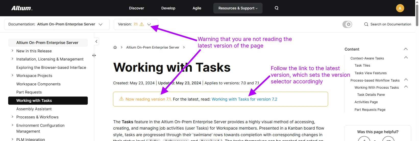 While software evolves from version to version, adding new features and enhancements to its functionality, the associated versioned documentation for Altium On-Prem Enterprise Server may be impacted only in certain areas. Many pages will not be affected by the next version of the software, so the same content that is applicable previously, also now applies to that later version as well. Indication is therefore provided on each page, to show which versions of the software that page's content can be used for.