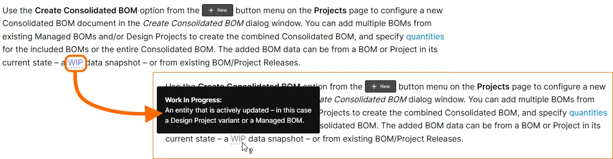 Hover text (or a tool tip) is used to provide additional, helpful guidance in the context of a specific entry on a page. This could be, for example, an explanatory note for an entry, or perhaps a glossary-like explanation of terminology being used. A tool tip can appear in one of two ways: