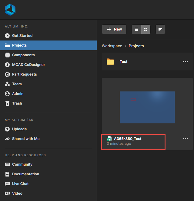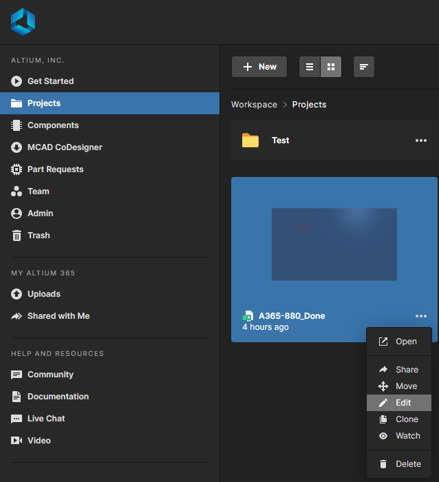 Renaming an existing managed project is simple. Go to your Altium 365 Workspace via a supported web browser and navigate to the Projects section. Locate the managed project you are editing, click on the ellipsis button