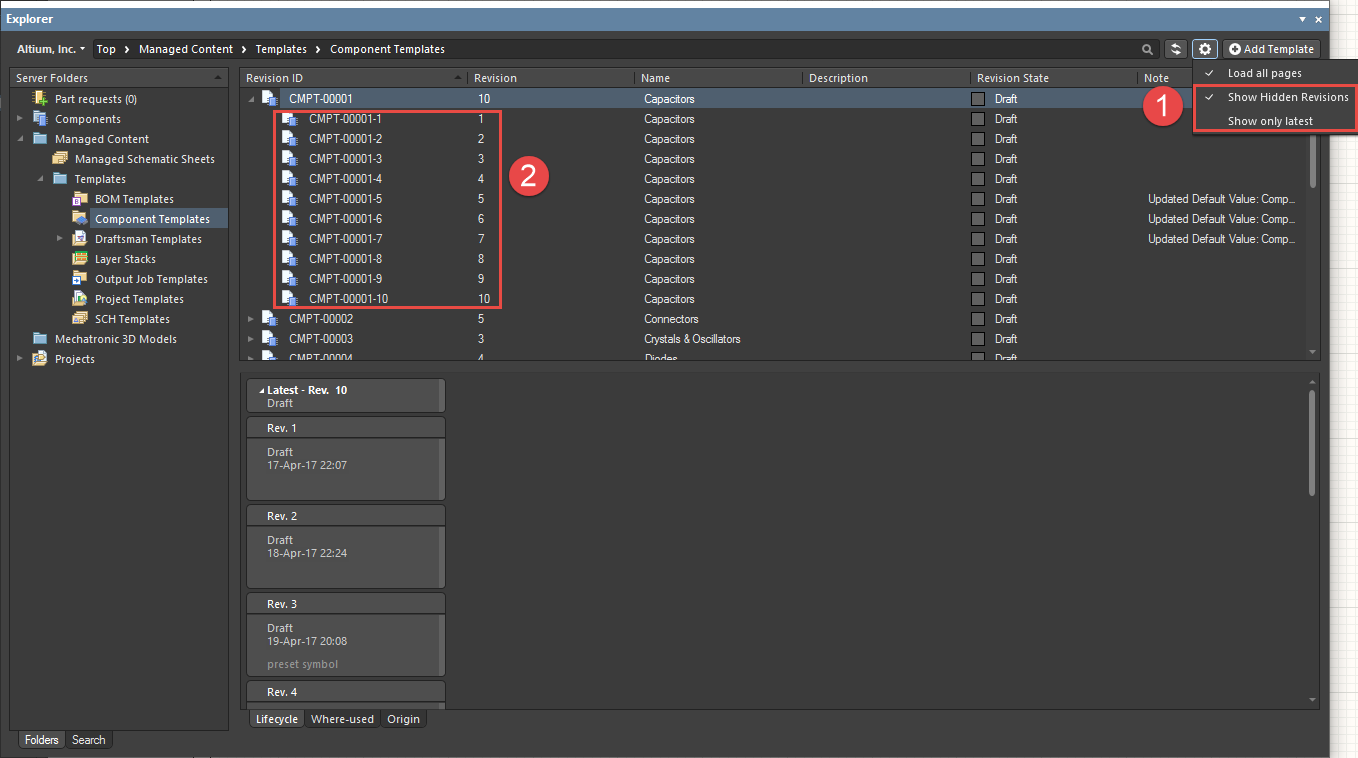 Components, templates and other managed server items can be reverted via the Explorer panel. By default, only the latest revisions are displayed for each item. However, the user can display the the individual revisions by enabling Show Hidden Revisions and disabling Show Only Latest and edit the revision through right click context menu.