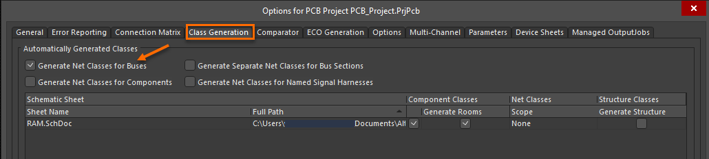 If you get the error message Rule's specified scope does not exist during Update Schematics after changing the rules for buses in the Constraint Manager on the PCB side, the root cause of this error could be that the Generate Net Classes for Buses option is enabled on the Class Generation tab of the Project Options dialog.