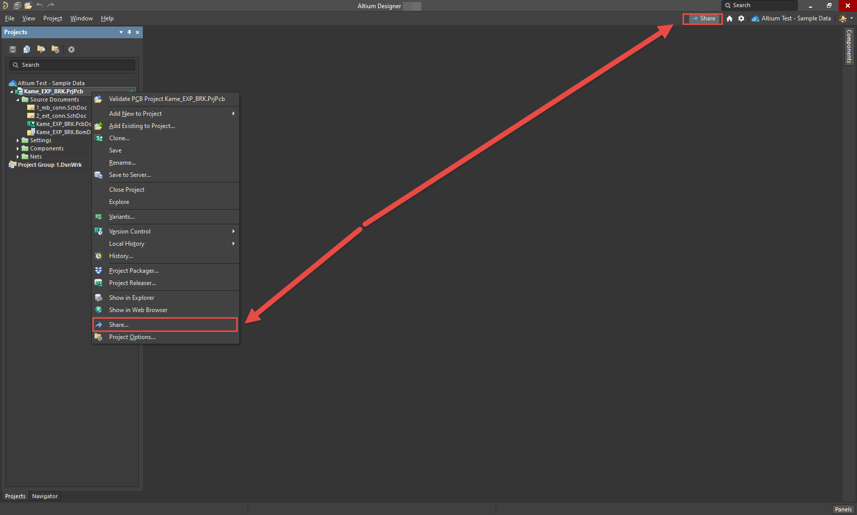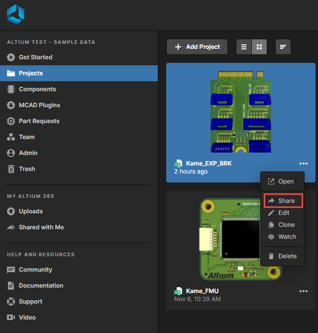 A project hosted in an Altium 365 workspace can be shared by the project's owner or an administrator by default. There are two ways are sharing: