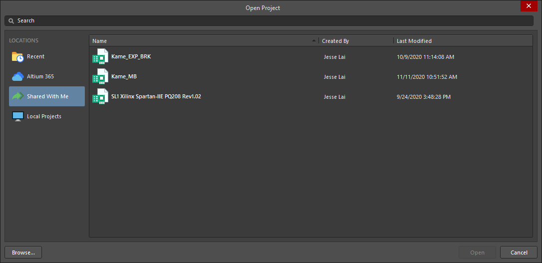 As an outside user, when opening the managed project (File ยป Open Project) shared without invitation to the workspace, please set the Location to "Shared With Me", and you will be see a list of shared designs.