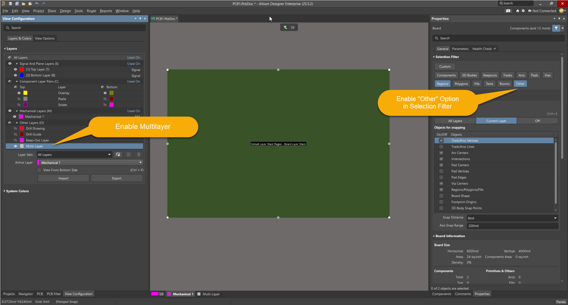 - The Multilayer visibility being turned off in the View Configuration panel, making multilayer elements (such as board regions) invisible and unselectable.