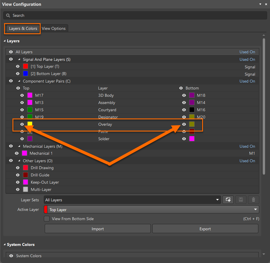 To resolve the issue verify that your overlay layers are visible by going to the menu View » Panels » View Configuration. Once the View Configuration panel is open, on the Layers & Colors tab, press on the eyeball next to the overlay layer for both Top and Bottom Overlay layers as needed.