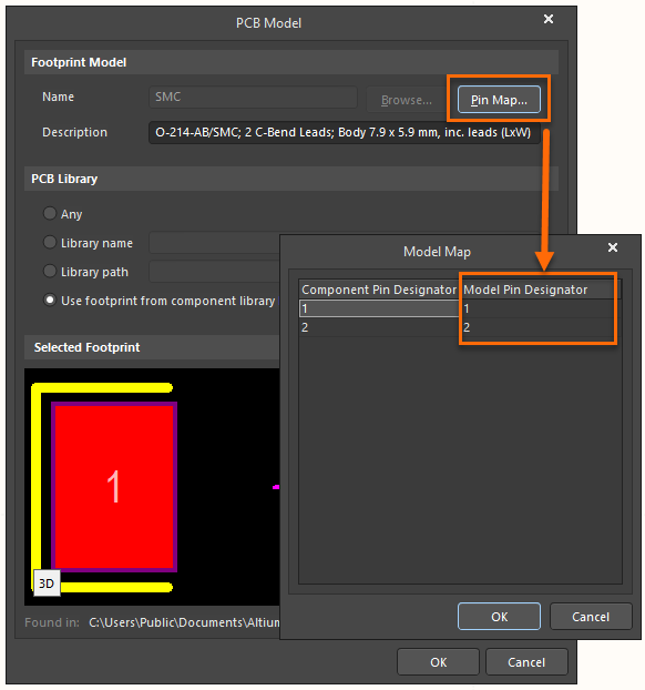 NOTE: Verifying Pin to Pad mapping. At this point, the Schematic to Footprint Pads should be verified, as there is automatically assumed that the referenced footprint Pad will match the schematic designator value. When Editing the schematic component’s PCB footprint, click the Pin Map… button. The Footprint Pin Designator (Pad) will need to be manually checked in the PcbLib or in the Pcb Document, as the Pin Map does not reflect the true value.