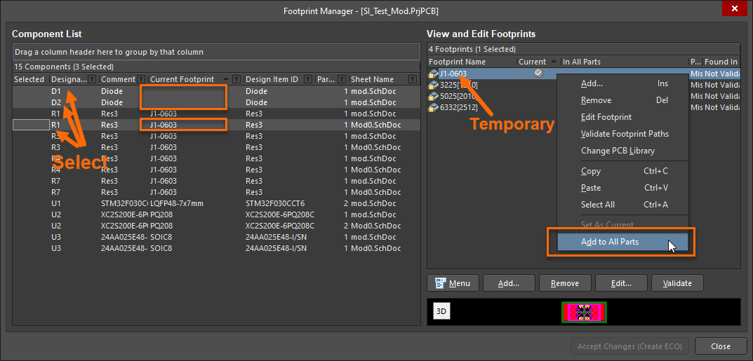 - Right-click on the footprint in the upper right pane and select Add to all parts.