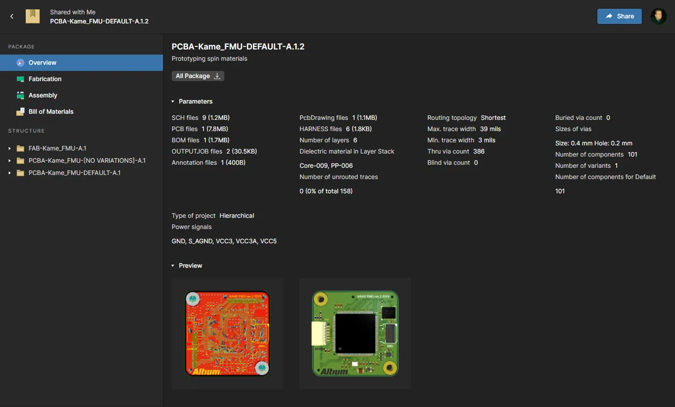 Средство просмотра открывается в отдельной вкладке браузера, где доступна обзорная информация о проекте, с ключевыми данными о плате, и где вы можете просматривать структуру опубликованных данных (и загружать файлы по отдельности, если необходимо). Отсюда вы также можете загрузить полный пакет. Также доступны подстраницы Fabrication, Assembly и Bill of Materials, где страницы Fabrication и Assembly используют интерфейс Web Viewer, предоставляющий мощные интерактивные возможности и позволяющий любому пользователю, которому был опубликован пакет, добавлять комментарии. Представление Fabrication отображает данные Gerber этого выпуска.