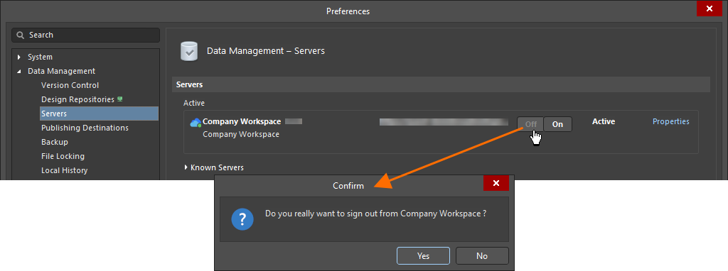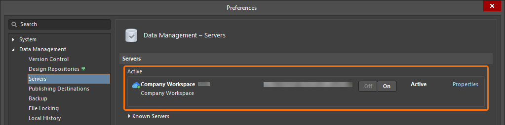 The Data Management – Servers page of the Preferences dialog. When connected to the Workspace, that Workspace will be presented as the Active Server. You can only be actively connected to one Workspace through the software at a time. If you have previously connected to other Workspaces from that instance of Altium Designer, they will be listed as Known Servers. While actively connected to one Workspace, you could also be connected to another (it will not be the active Workspace).