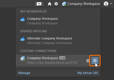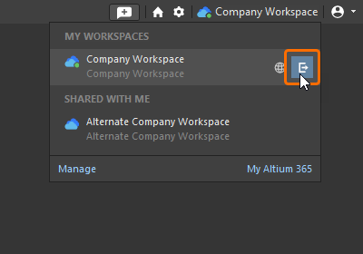 when Altium Designer is not connected to a Workspace). In the subsequent menu, all Altium 365 Workspaces that are available to you will be listed across two sections: